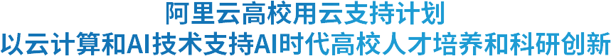 阿里云高校用云支持计划旨在为高等院校师生提供包括算力、培训、平台 等全方位支持,助推高校计算机学科建设、培养数字经济时代的前沿技术人才、为多学科跨 领域科研探索提速增效。